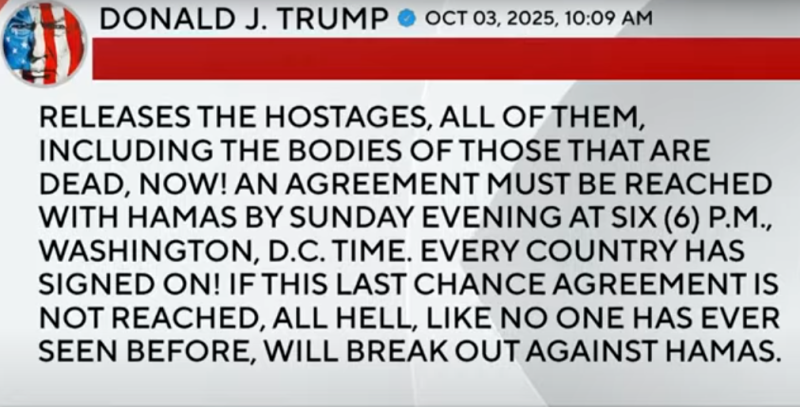 Trump emphasized urgency, posting: β€œAn agreement must be reached by 6 p.m. Washington time on Sunday. Hamas has three to four days to respond.”