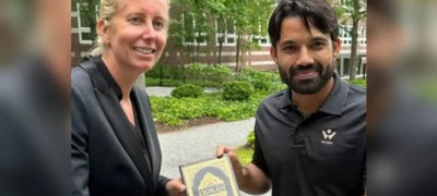A Harvard professor receives the Holy Quran from Muhammad Rizwan.